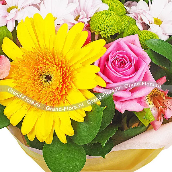 Стандартный (на фото): роза розовая - 7 шт, гербера желтая - 2 шт, альстромерия розовая - 4 шт, хризантема кустовая зеленая - 3 шт, хризантема кустовая светлая - 2 шт, рускус, фетр желтый. Примерный размер: 25Х25 см.