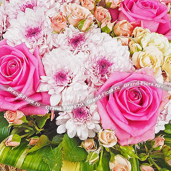 Стандартный (на фото): роза розовая - 7 шт, роза кустовая розовая - 6 шт, хризантема кустовая светло-фиолетовая - 4 шт, лист аспидистры загнутый - 4 шт, упаковка натуральная.