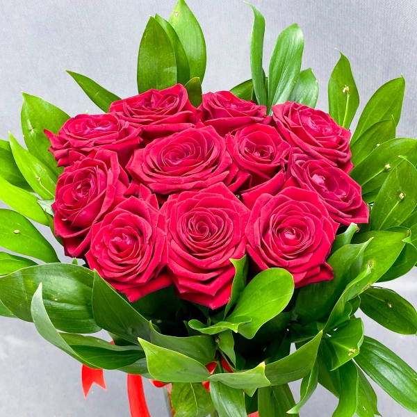 11  роз: роза красная (70см) - 11 шт., рускус (или салал) - 6 шт., упаковка, лента.