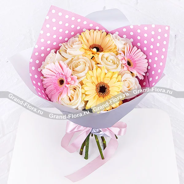 роза белая - 15 шт., гербера розовая/оранжевая - 4 шт., гербера желтая/кремовая - 4 шт., упаковка, лента. Примерный размер: 40Х40 см.