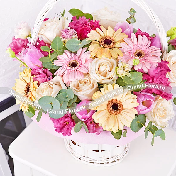 Стандартный: роза белая - 4 шт., гербера розовая - 1 шт., гербера желтая - 2 шт., тюльпан розовый - 3 шт., эустома розовая - 3 шт., эвкалипт, оазис, корзина. Примерный размер: 25Х30 см.