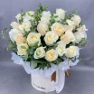 25 роз: роза белая (Россия) 50 см.,- 25 шт., коробка круглая средняя (20*30) - 1 шт., эвкалипт, оазис.